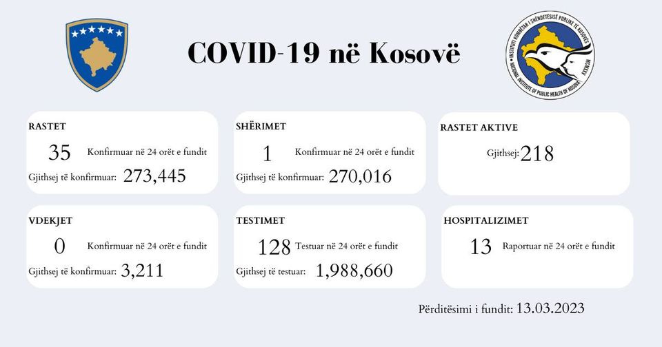 Sipas IKSHPK-së gjatë 24 orëve janë konfirmuar 35 raste të reja, pas 128 testimeve të bëra.