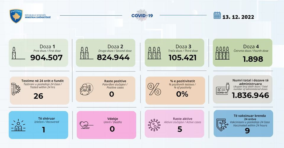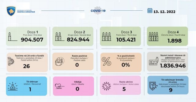 Ministria e Shëndetësisë ka njoftuar se asnjë rast pozitiv me COVID-19 nuk është paraqitur gjatë 24 orëve të fundit.