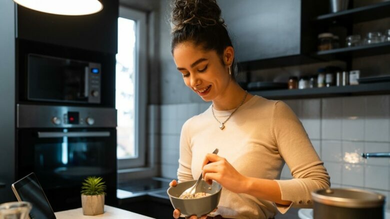 One young caucasian woman having breakfast in the kitchen at home female adult eating in her apartment while standing having healthy vegan meal muesly or oatmeal happy smile real people copy space