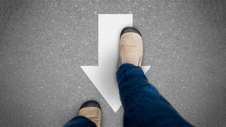 One wearing jeans and brown suede shoes walking on opposite direction path representing think different, new idea, liberal, contrary, unique.