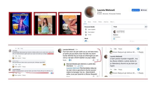Një gjë tjetër që bie në sy është manipulimi i këtyre faqeve online me komente të ndryshme, kinse kanë përdorur produktin e reklamuar. Ne kemi identifikuar disa profile të rreme që komentojnë në secilin produkt të këtyre faqeve, nën pretekstin se e kanë blerë produktin dhe kanë përfituar nga ai, duke pretenduar se janë shëruar pas përdorimit.