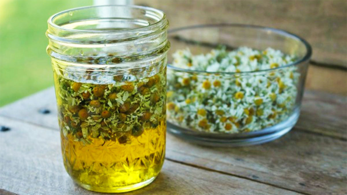 Në një kavanoz të madh qelqi, hedhim gjysëm litër vaj ulliri ekstra të virgjër, më pas shtojmë rreth 3-4 lugë të plota gjelle me lule kamomili.