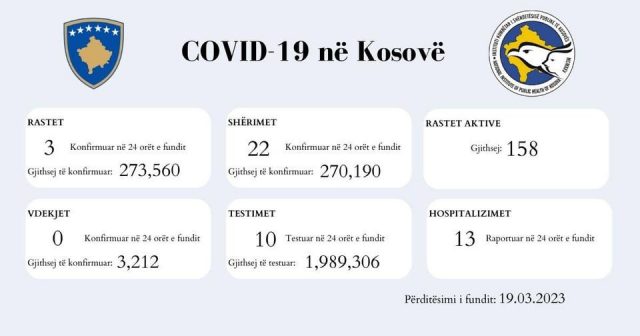 Instituti Kombëtar i Shëndetësisë Publike të Kosovës ka njoftuar se gjatë 24 orëve të fundit, tre raste të reja me COVID-19, janë konfirmuar pas 10 testimeve të kryera.