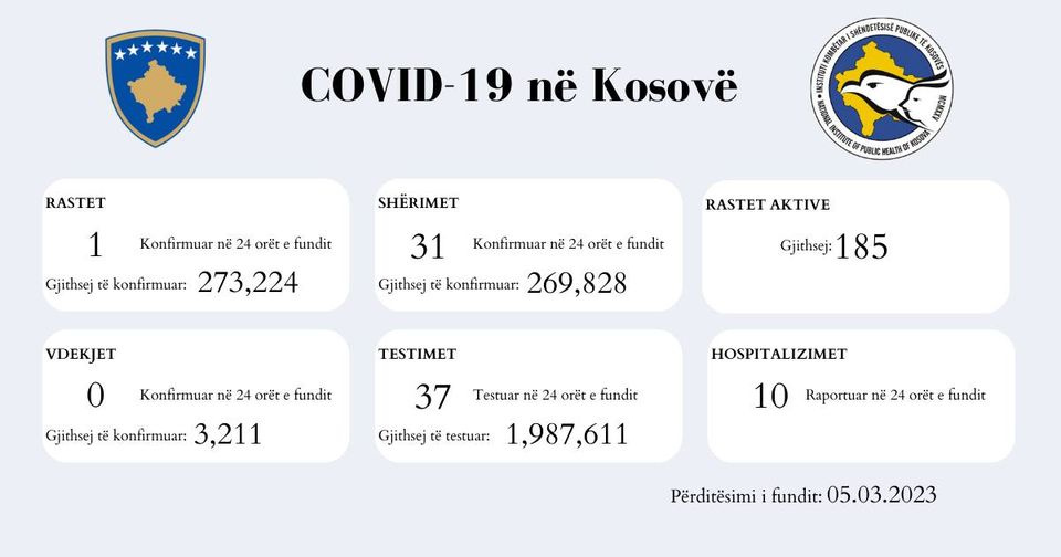 Instituti Kombëtarë i Shëndetësisë Publike të Kosovës ka njoftuar se vetëm një rast është konfirmuar pozitiv me COVID-19, pas 37 testimeve të bëra.