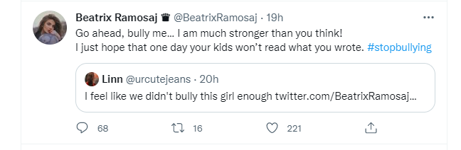 “Vazhdo, më bullizo. Jam më e fortë se sa mendon. Shpresoj që një ditë fëmijët e tua të mos e shohin këtë që ke shkruar. Ndaloni bullizmin”, u përgjigj Trixa.