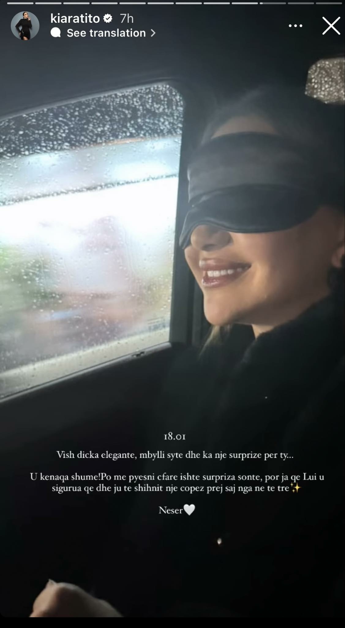 “Vish diçka elegante, mbylli sytë dhe ka një surprizë për ty U kënaqa shumë. Po më pyesni çfarë ishte surpriza sonte, por ja që Lui u sigurua që edhe ju të shihnit një copëz prej saj nga ne të tre”, ka shkruar moderatorja në fotografinë që që ka hedhur në Instastory, ku shfaqet shumë e lumtur dhe me sytë mbyllur, shkruan Arbresh.info