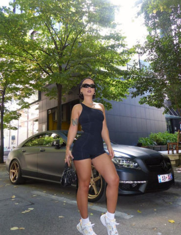 Autorja e “Bad Rossita” pozoi e veshur me një trupore me ngjyrë të zezë dhe të shkurtër, të cilat i kombinoi me atlete të bardha dhe çantë të vogël dore.