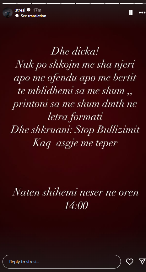 Edhe ne si popull kemi të drejt të flasim e të japim mendime, duhet ti themi stop, duhet të mblidhemi gjithmonë për këto tema, dhe nesër në orën 14:00 unë do jem në Top Channel, me shumë njerëz patjetër me gjithë shoqërinë time edhe të ju themi stop bullizimit, kjo çka ka ndodhë në këtë big brother edhe të merren masa jashtëzakonisht të rrepta.