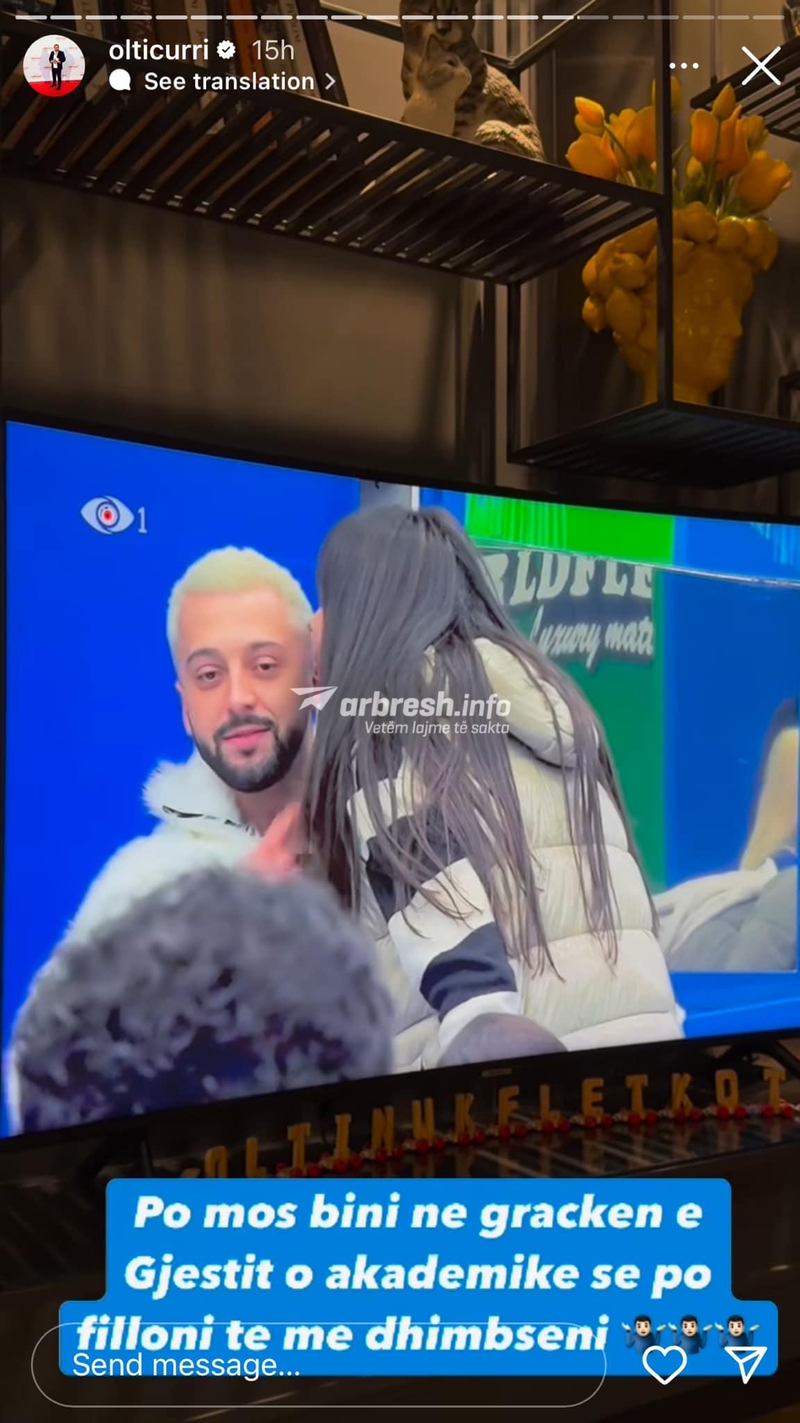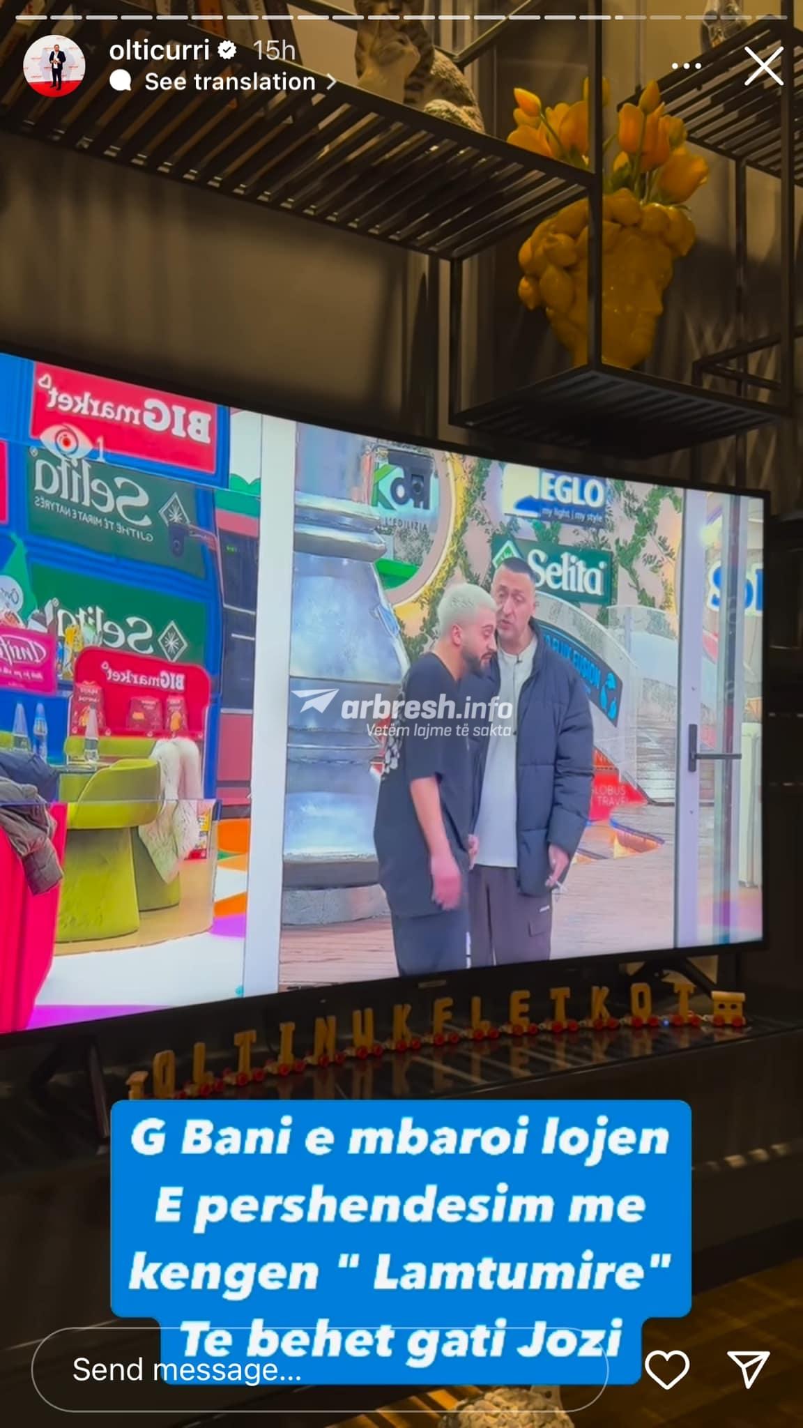 Në Instagram, ka reaguar edhe gazetari dhe opinionistit shqiptar, Olti Culli, i cili në videon që ka shpërndarë në Instastory, shkruan “G Bani e mbaroi lojën, e përshëndesim me këngën “Lamtumirë”. Të bëhet gati Jazi”, shkruan Olti Curri./Arbresh.info/