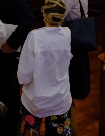 Pamja e saj u përshtat me një palën syze të tejdukshme diellin, çantë të zezë dhe një unazë të madhe ndërsa flokët e bardha i la të kapura në një stil me gërsheta