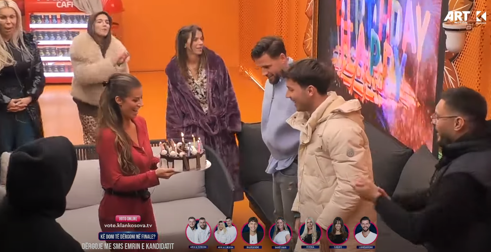 Ishte Santiana ajo që ia sjelli Blerandos tortën e ditëlindjes ku mbishkruhet “Team Blerando”, derisa të gjithë një zëri kënduan vargjet “shumë urime për ty”.