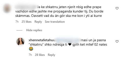 “Ja ke shkatërru jetën njeriut në Big, edhe prap vazhdon edhe jashtë me propagandu kundër tij… Ai s’ka me ‘kon’ kurrë i yti”, ishte komenti që ajo mori nga një përdorues, duke e pasur fjalën për Gjestin.