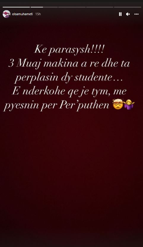 “Ke parasysh, tre muaj makina e re dhe ta përplasin dy studente. E ndërkohë që je tym, më pyesin për Përputhen”, ka shkruar ajo.