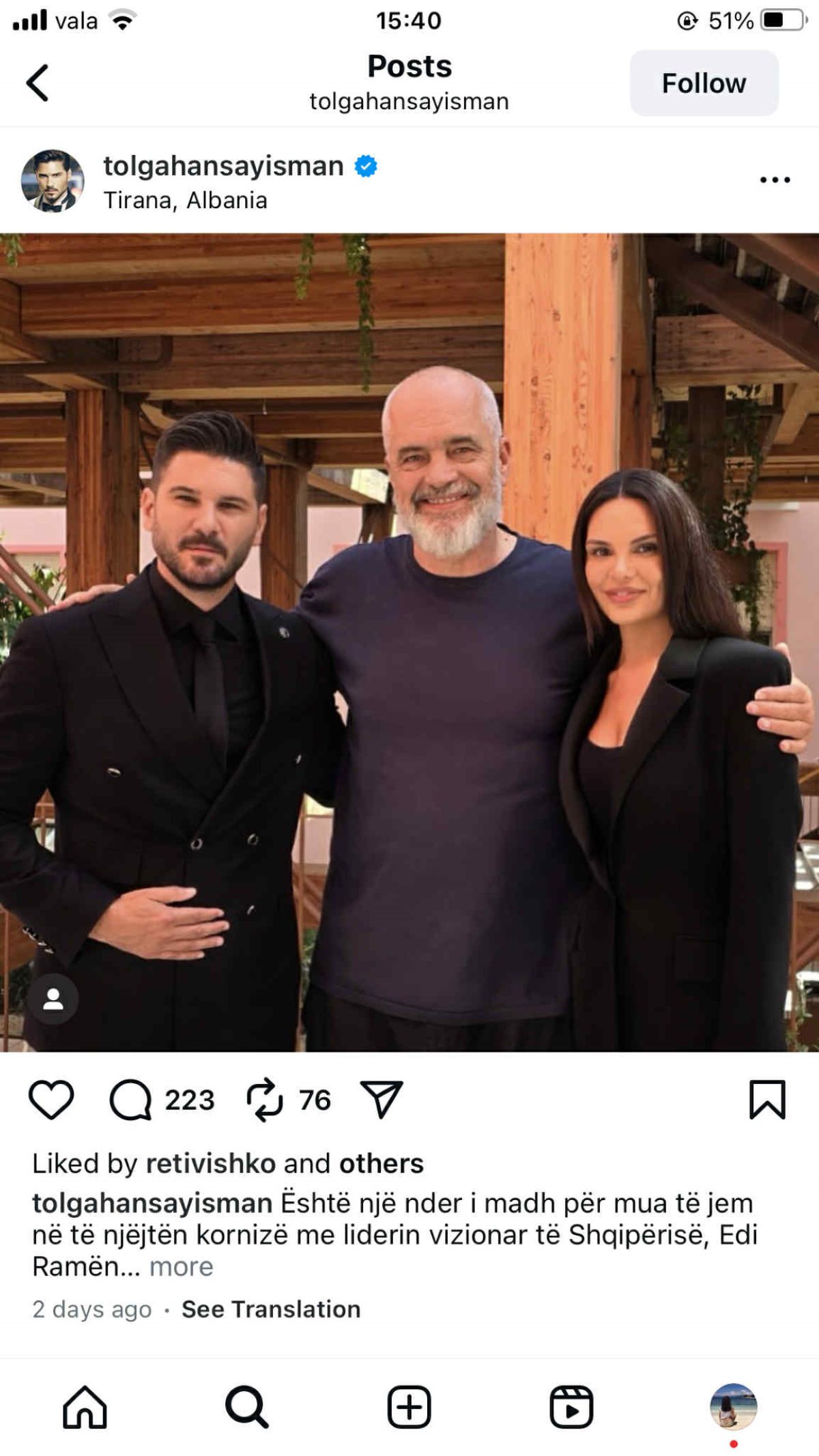 Aktori i njohur turk i serialeve po ashtu të njohura, Tolgahan Sayisman, ka publikuar në llogarinë e tij në Instagram një fotografi bashkë me kryeministrin shqiptar, Edi Rama dhe gruan e tij, Aleda Abazi.