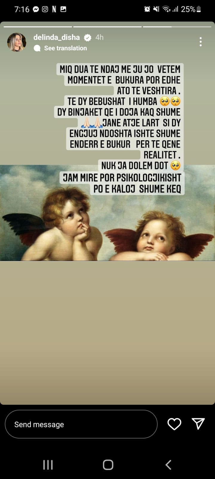 “Miq dua të ndaj me ju jo vetëm momentet e bukura, por edhe ato të vështira. Të dy bebushat humba, dy binjakët që i doja kaq shumë janë atje lart si dy engjëj, ndoshta ishte shumë ëndërr e bukur për të qenë realitet. Nuk ia dolëm dot. Jam mirë, por psikologjikisht po e kaloj shumë keq”, shkruan Delinda.