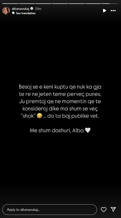 Ish-banorja e Big Brother VIP Kosova, Alba Vukaj përmes një postimi në InstaStory ka bërë të ditur se nuk ka asgjë të re në jetën e saj, përveç punës.