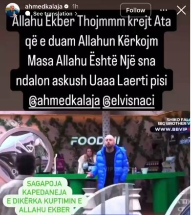 “Pse the Allahu-Ekber, e di kush thotë Allahu-Ekber, ata që presin koka, çfarë je ti, terrorist je këtu, për çfarë ke ardhur ti këtu”, dëgjohet duke thënë Laerti në një video, e cila është shpërndarë edhe nga hoxha Ahmed Kalaja.