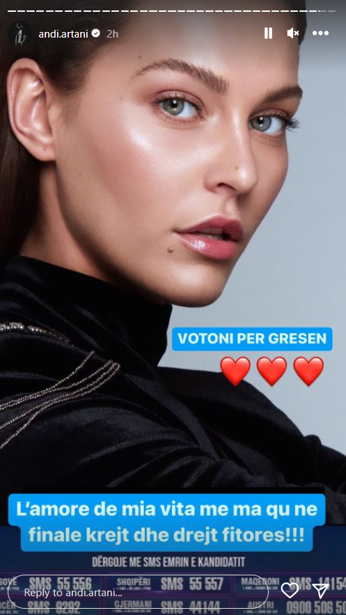 “Votoni për Gresën. Dashurinë e jetës time me ma dërgu në finale dhe drejtë fitores”, ka shkruar Andi sipër një imazhi të Gresës.