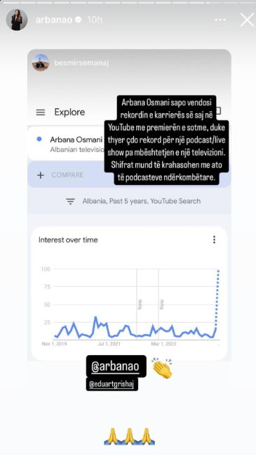“Arbana Osmani sapo vendosi rekordin e karrierës së saj në You Tube me premierën e sotme duke thyer çdo rekord për një podcast/live show pa mbështetjen e një televizioni. Shifrat mund të krahasohen me ato të podcasteve ndërkombëtare”, thuhet në një prej Instastoryve që ka ndarë moderatorja.