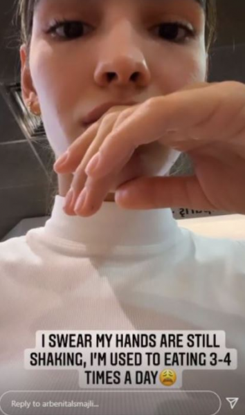 “Shikoni si po më dridhen duart, pasi jam mësuar të ushqehem tre-katër herë në ditë”, ka shkruar modelja.