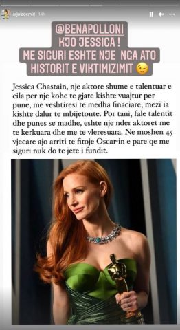 “Jessica Chastain, një aktore shumë e talentuar e cila për një kohë të gjatë kisjte vuajtur për pun, me vështirësi të mëdha financiare, mezi ia kishte dalur të mbijetonte. Por tani, falë talentit dhe punës së madhe, është një ndër aktoret më të kërkuara dhe më të vlerësuara. Në moshën 45-vjeçare ajo arriti të fitojë ‘Oscar’-in e parë që me siguri nuk do të jetë i fundit”, shkruhej në postim.