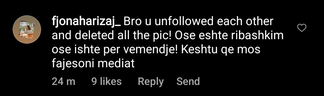 “Vëlla, ju nuk e ndiqnit më njëri-tjetrin dhe i fshitë të gjitha fotografitë. Ose është ribashkim ose ishte për vëmendje. Edhe këngën e fshive. Kështuqë mos fajësoni mediat” – shprehet dikush.