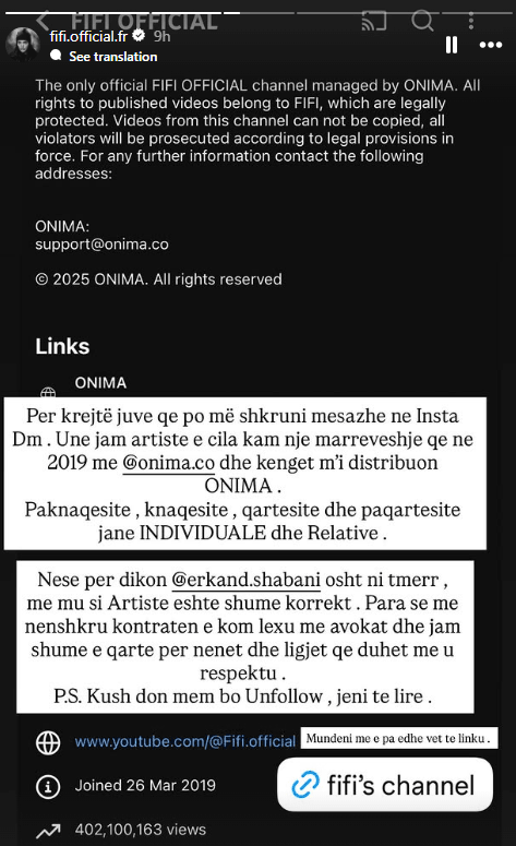 Filloreta Raçi – Fifi ka reaguar në rrjete sociale marrë parasysh bashkëpunimin që ka me kompaninë muzikore “Onima” prej shtatë vitesh.
