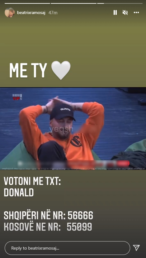 Ajo publikoi në InstaStory një video të të dashurit të saj, ku shihet teksa interpreton këngën “Faj”, të cilën Ramosaj e publikoi pas daljes nga shtëpia, si një dedikim për aktorin.