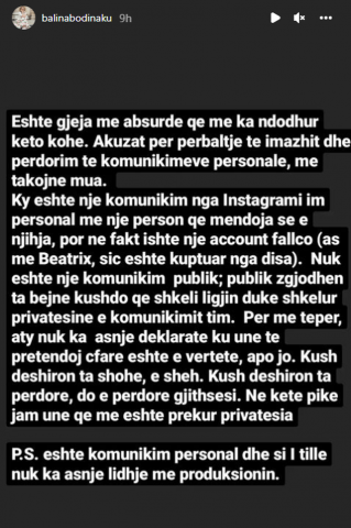 Në faqen e saj në Instagram, Beatrix publikoi disa foto ku tregon një bisedë të opinionistes së Big Brother, Balina Bodinaku, që flet me dikë ndërsa i shkruan se këngëtarja ishte larguar për në Dubai me të dashurin.
