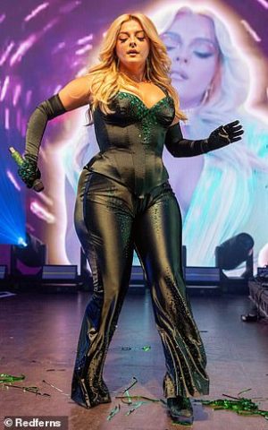Ylli i muzikës pop dukej asgjë më pak se sa sensacionale teksa doli në skenë me një korse të zezë, që ishte zbukuruar me bizhuteritë me shkëlqim jeshil, shkruan DailyMail.