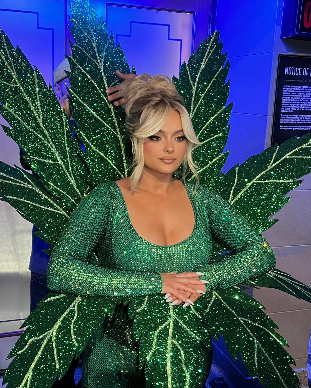 Bebe kishte veshur një kostum të gjelbër me disa gjethe pas shpinës, duke marrë kështu pamjen e një gjetheje kanabisi.