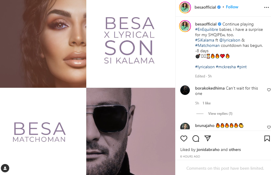 “Kam një befasi për shqipet e mia. “Si kalama” ft Lyrical Son, numërim prapa ka filluar, -8 ditë”, ka shkruar Besa në mbishkrimin e postimit.