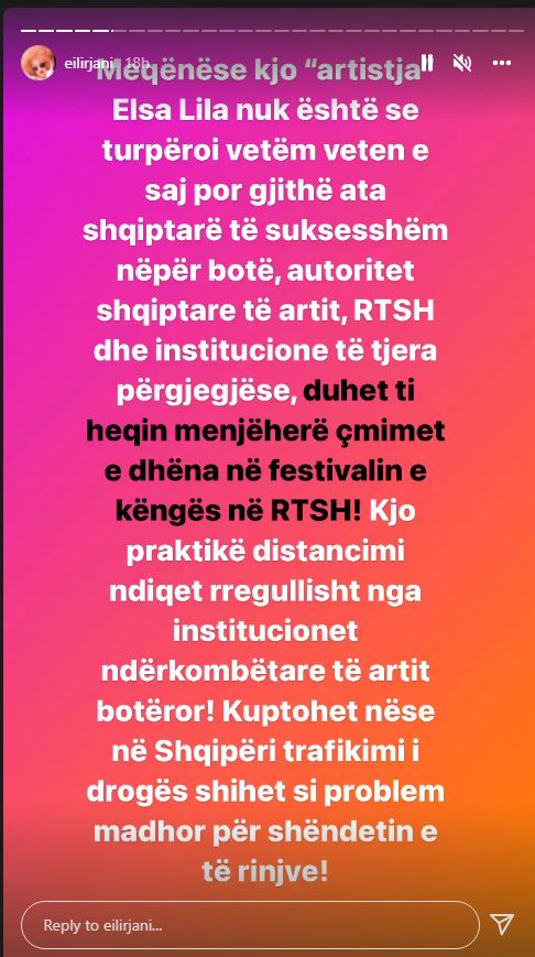 “Meqë kjo artistja Elsa Lila nuk është se turpëroi vetëm veten e saj, por gjithë ata shqiptarë të sukseshëm nëpër botë, autoritetet shqiptare të artit RTSH dhe institucione të tjera përgjegjëse duhet t’i heqin menjëherë çmimet e dhëna në festivalin e këngës në RTSH! Kjo praktikë distancimi ndiqet rregullisht nga institucionet ndërkombëtare të artit botëror. Kuptohet, nëse në Shqipëri trafikimi i drogës shihet si problem madhor për shëndetin e të rinjve“, shkruan biznesmeni në Instagram.