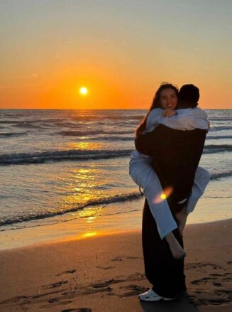 E shoqëruar nga i dashuri i saj, Donald Vishaj, ata shfaqen duke e shijuar perëndimin e diellit buzë detit.