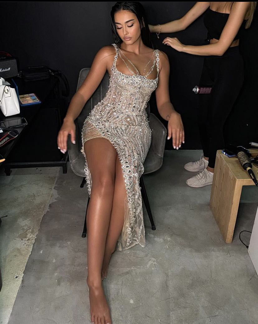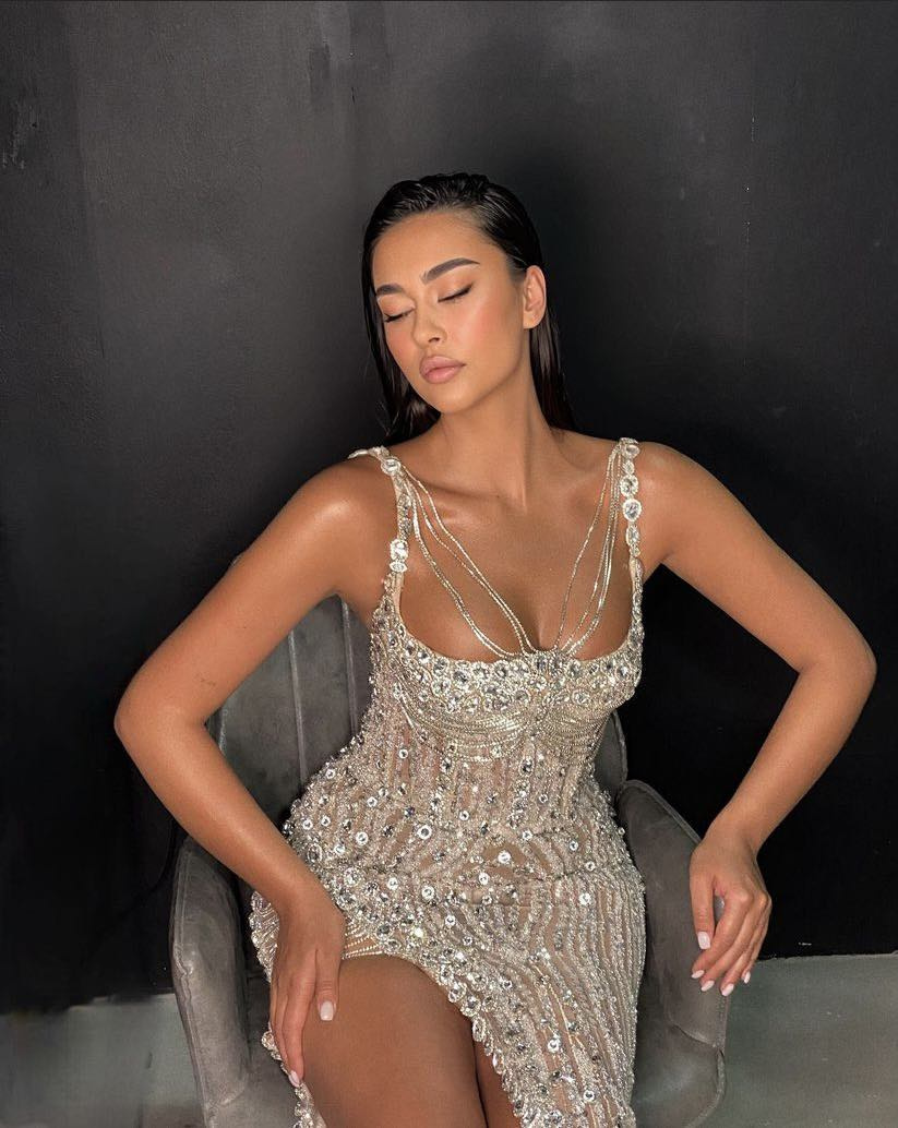 Së fundmi, ajo shkëlqen e tëra me një fustan elegant të gjatë të mbushur me gurë me shkëlqim dhe hapur në njërën anë.