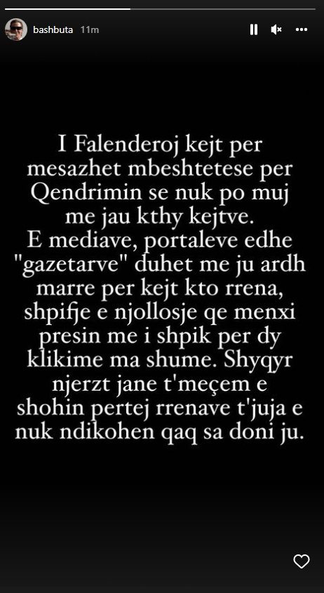 “I falënderoj krejt për mesazhet mbështetëse për Qëndrimin se nuk po mundem t’jua kthej të gjithëve. E mediave, portaleve edhe ‘gazetarëve’ duhet me ju ardhë marre për krejt këto rrena, shpifje e njollosje që mezi presin me i shpifë për dy klikime më shumë. Shyqyr njerëzit janë të mençur e shohin përtej rrenave të juaja, e nuk ndikohen aq sa doni ju”, ka shkruar Buta në InstaStory. /arbresh.info/