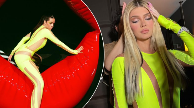 Një nga veshjet me të cilën mori vëmendje ishte një trupore me ngjyrë të gjelbër neon e kombinuar me material të tejdukshëm në formë të vijave të cilat ia zbulonin disa pjesë të turpit.