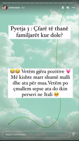 E pyetur se çfarë i thanë familjarët pas daljes së saj, ajo u përgjigj kështu: Vetë gjëra pozitive, më kishte marr shumë malli dhe ata për mua. Vetëm po çmallem sepse ata do ikin përsëri në Itali.