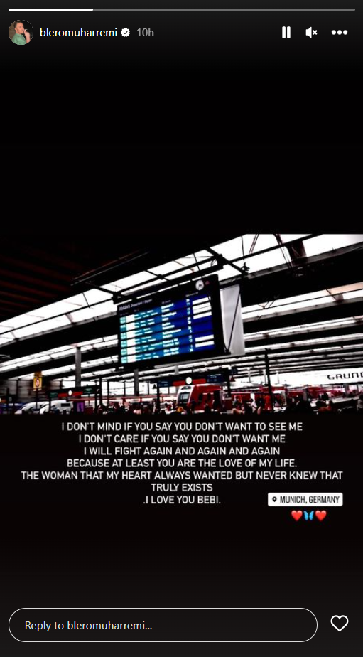 “Nuk më intereson nëse thua që nuk dëshiron të më shohësh mua, nuk më intereson nëse thua se nuk më do, do të luftoj përsëri, përsëri e përsëri sepse në fund të fundit ti je dashuria e jetës time. Gruaja që zemra ime donte gjithmonë, por kurrë nuk e dinte që ekzistonte vërtetë. Të dua zemër”, ka shkruar Blero, përcjell Arbresh.info