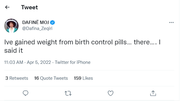 “Kam shtuar peshë nga pilulat kundër shtatzënisë… ja… unë e thashë”, ka shkruar Dafina.