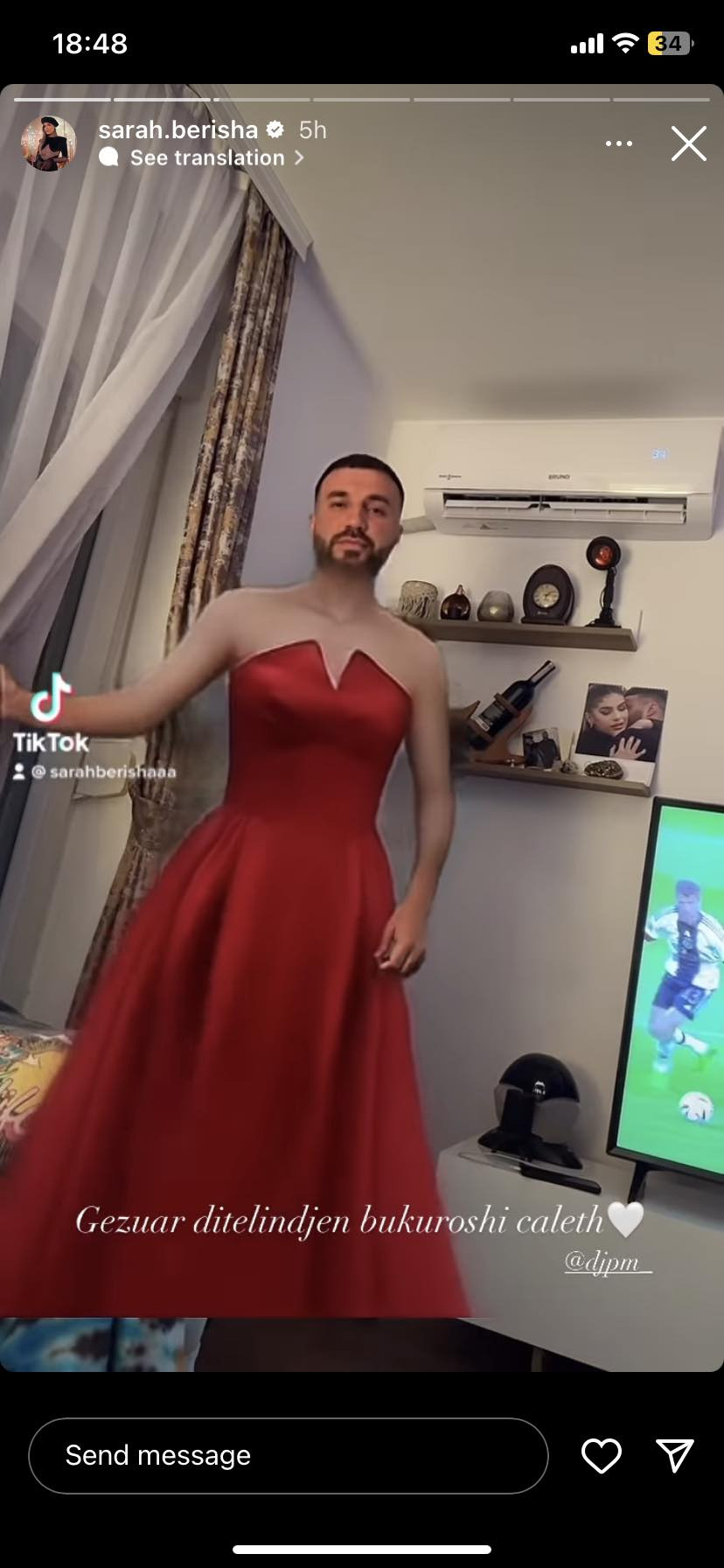 Ajo ka postuar një video të PM-it teksa ka qenë duke kërcyer, ndërkohë Sarah i ka vendosur një fustan-filtër në trupin e tij.