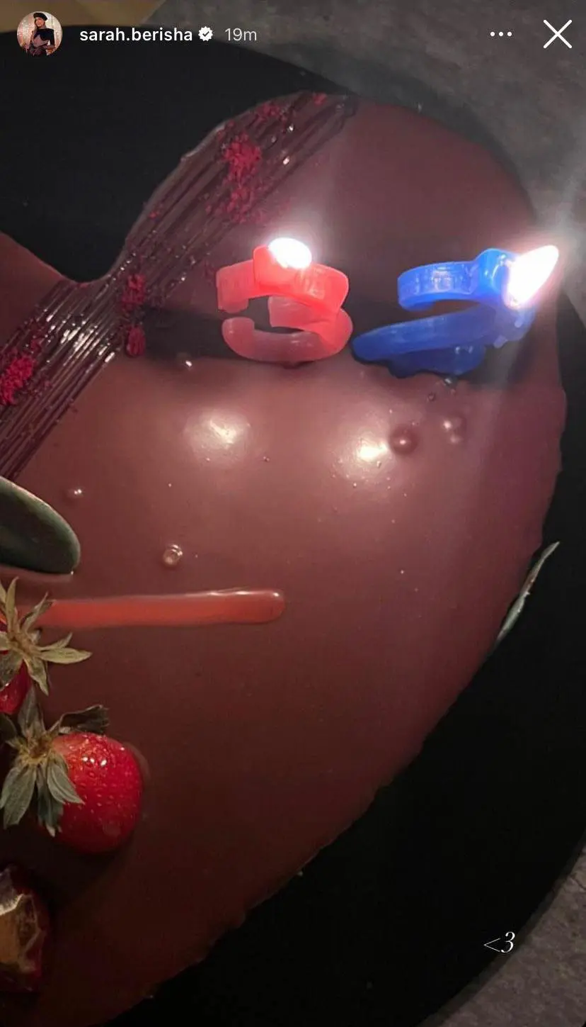 Tutje, ajo ka zbuluar edhe tortën që i ka bërë partnerit ku shihet në formë zemre të vendosur edhe qirinjtë e vjetorit të 32-të.