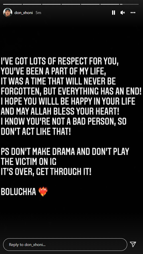 “Kam shumë respekt për ty, ti ke qenë pjesë e jetës sime, ishte një kohë që nuk do të harrohet kurrë, por gjithçka ka një fund! Shpresoj të jesh e lumtur në jetën tënde dhe Allahu e bekoftë zemrën tuaj! E di që ti nuk je njeri i keq, ndaj mos vepro kështu! Ps, mos bëj drama dhe mos luaj viktimën në “Instagram”, ka mbaruar kaloje atë. Boluchka”.