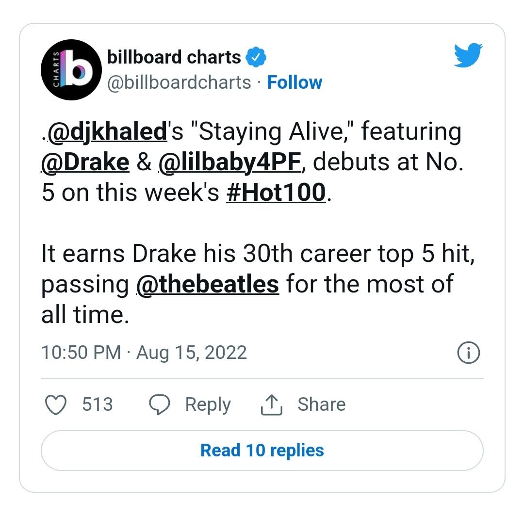 Reperi kanadez tani ka më shumë këngë në pesë hitet më të mira në historinë e Hot 100 se çdo artist tjetër falë bashkëpunimit të tij të fundit me DJ Khaled dhe Lil Baby në hitin “Staying Alive”. Kënga debutoi në numrin 5 në tabelën më të fundit, të datës 20 gusht, për Billboard.