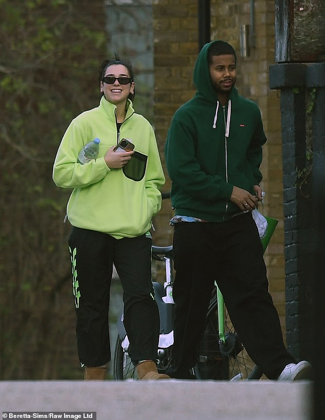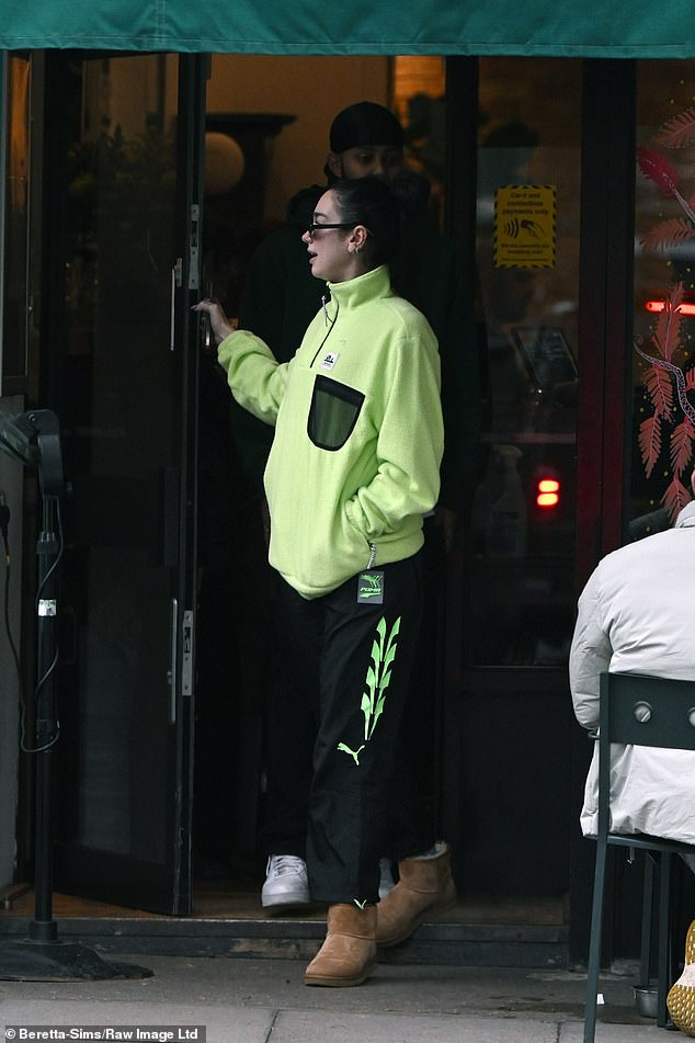 Ajo kishte veshur një xhaketë jeshile për këtë ditë së bashku me tutat e zeza, duke i kapur flokët e saj brune në stilin bisht, Dua i shtoi pamjes edhe më tepër klas me një palë syze dielli.