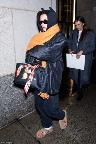 Ajo dukej “ngrohtë” ne një shall ngjyrë portokalli të ndezur dhe kishte veshur këpucë të animuara “Ugg”, të cilat detajonin imazhe kafshësh të qëndisura.