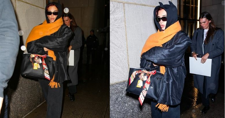 Interpretuesja e hitit “Blow Your Mind” theksoi buzët e saj të fryra teksa doli nga hoteli i saj dhe për aksesorë kishte me vete një çantë dore të mbështjellë me shall.