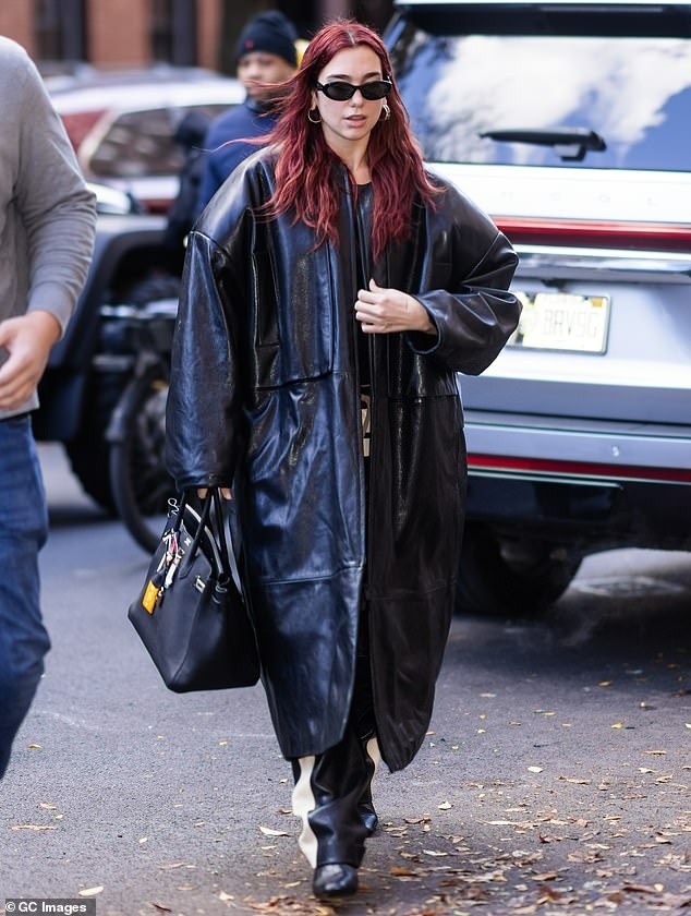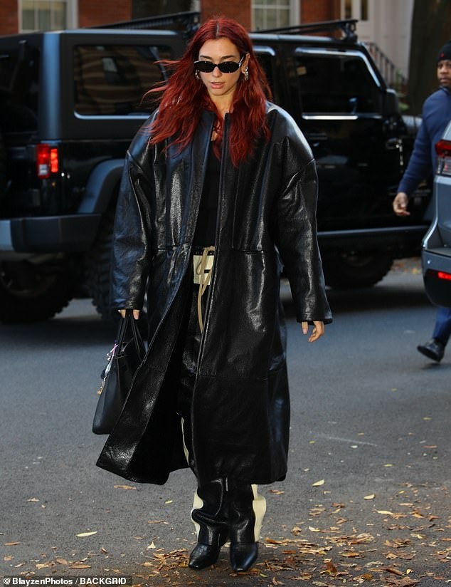 Teksa po largohej nga një hotel në New York, Dua kishe veshur një një pallto lëkure të zezë vintage, të cilën e shoqëroi me pantallona lëkure gjithashtu të zi dhe të bardhë me një bel elastik dhe kordon, dhe çizme me taka të larta.
