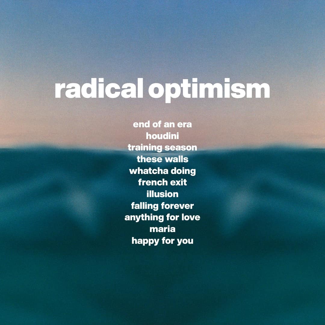 “Radical Optimism” përmban një koleksion prej 11 këngësh, përfshirë edhe hitet që tashmë kanë bërë jehonë si “Houdini”, “Training Season” dhe “Illusion”, të cilat janë të njohura nga publiku pasi u publikuan disa muaj më parë.