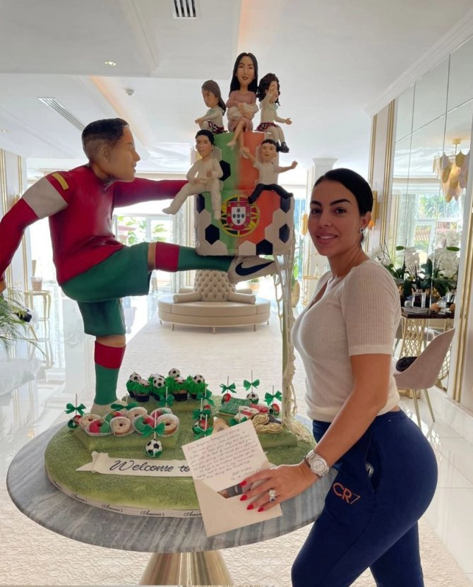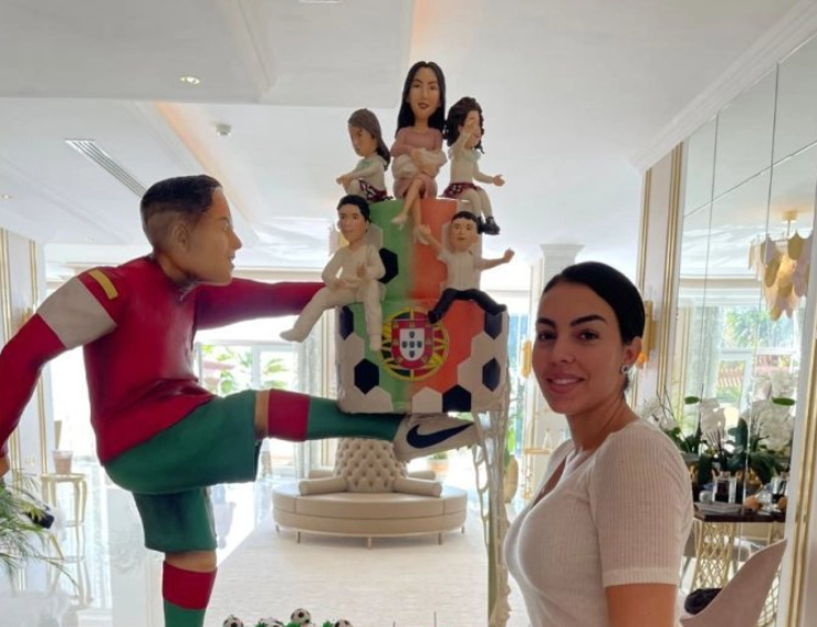 Në Katar, Georgina u prit me një dhuratë, tortë ku është paraqitur Ronaldo në formën e kombëtares portugeze. Lartësia është rreth 1.5 metra.